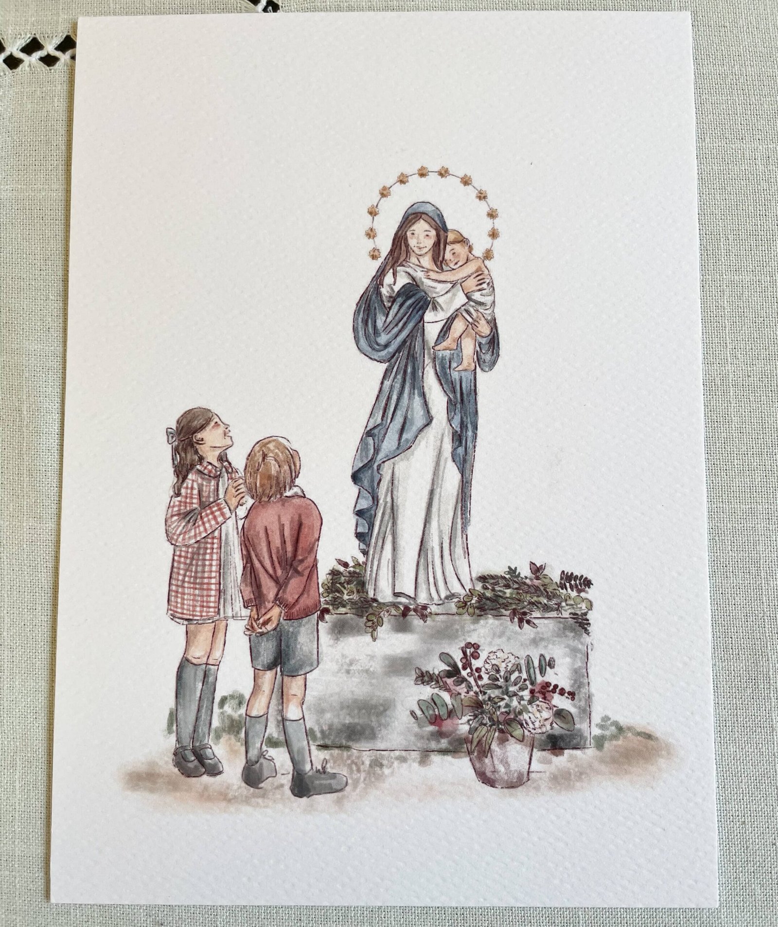 Lámina con ilustración de niños rezando a la Inmaculada Concepción . Perfecto para decorar habitaciones, o para regalar en ocasiones especiales. Dale un toque de dulzura al cuarto de tus pequeños con esta lámina para enmarcar.