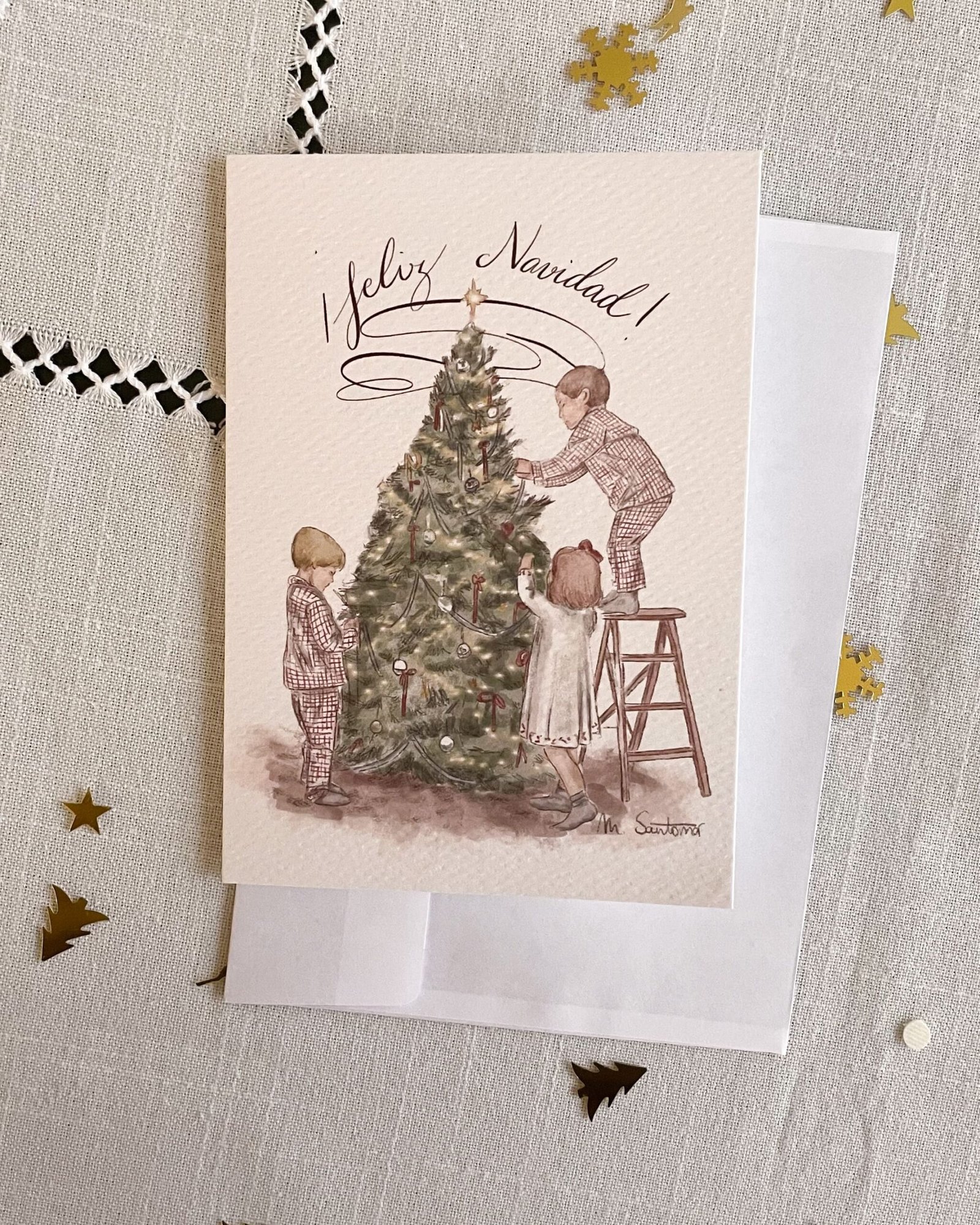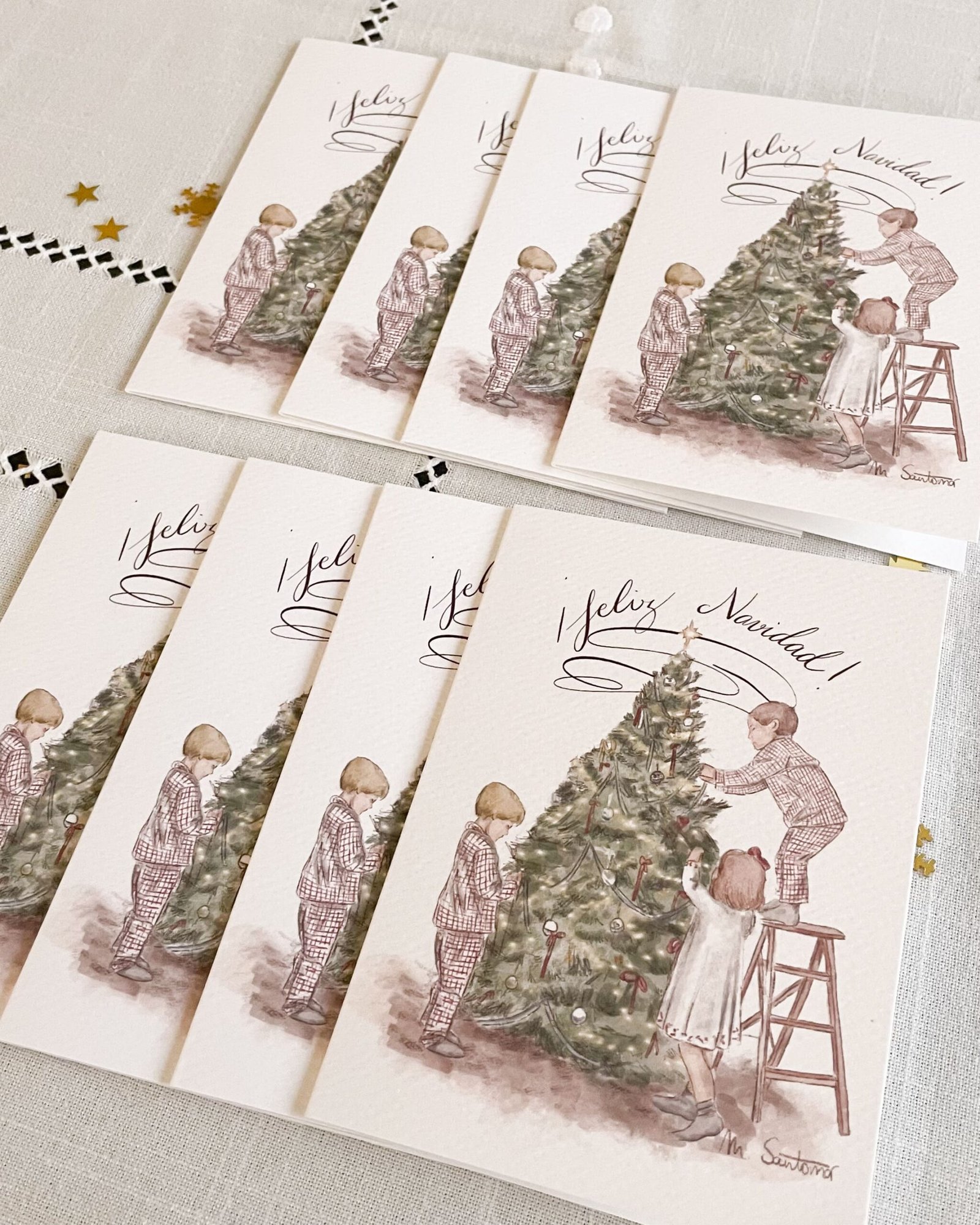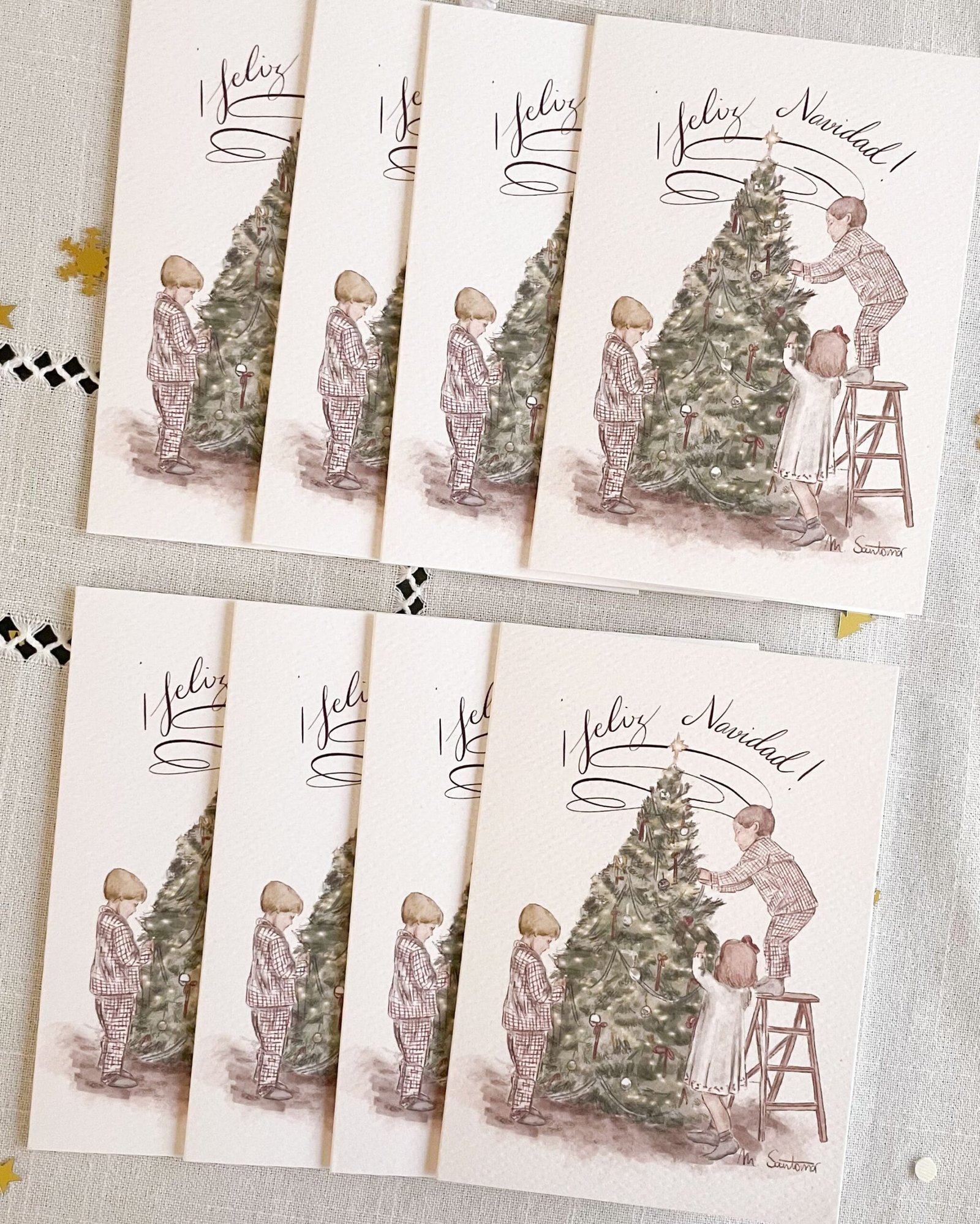 Este paquete de felicitaciones navideñas incluye 8 christmas con el diseño “Abeto”, una ilustración exclusiva de @Les_avions_en_papier. Ideal felicitar la navidad a familiares y amigos. Dale un toque auténtico y lleno de encanto a tus felicitaciones navideñas con estos christmas únicos.