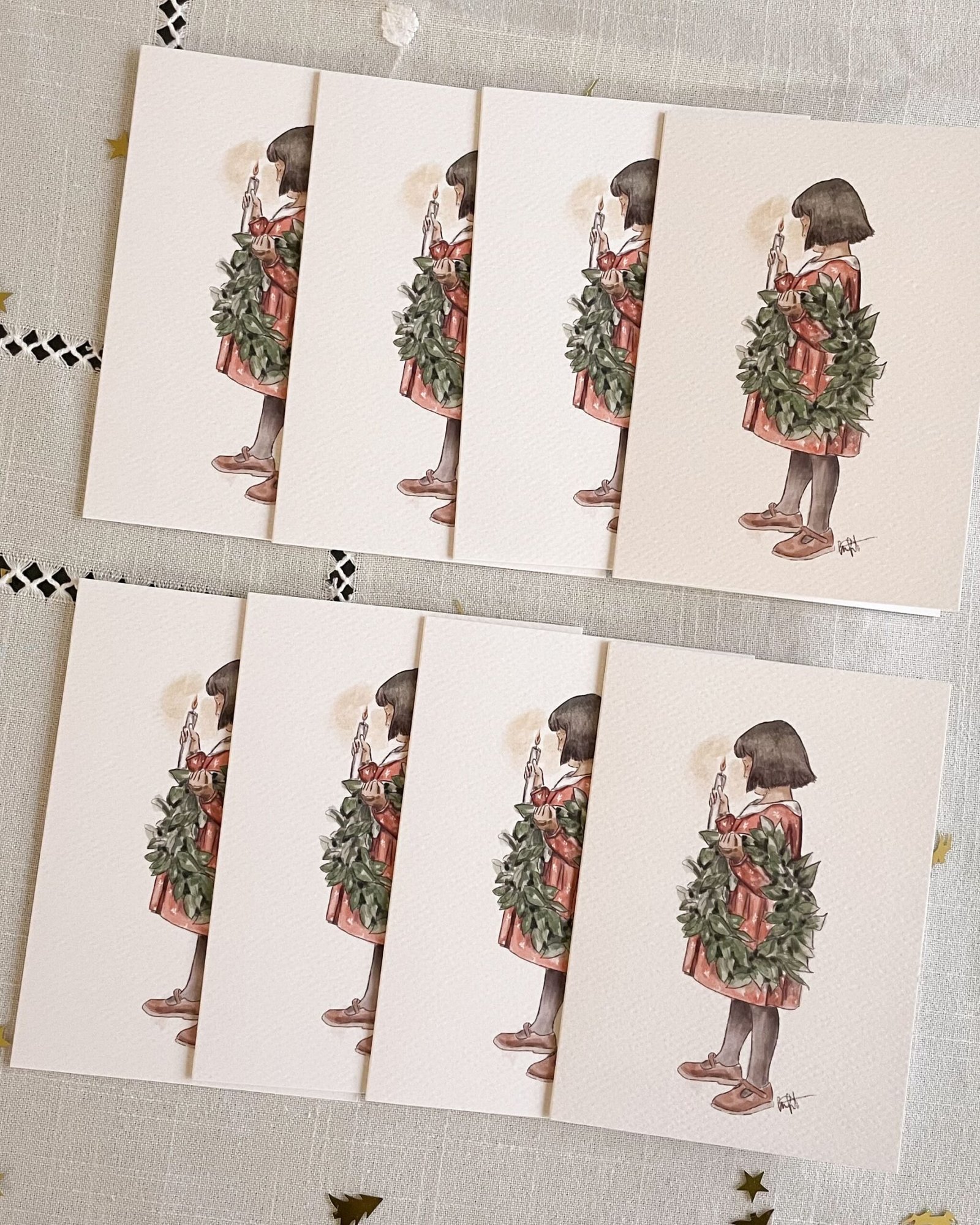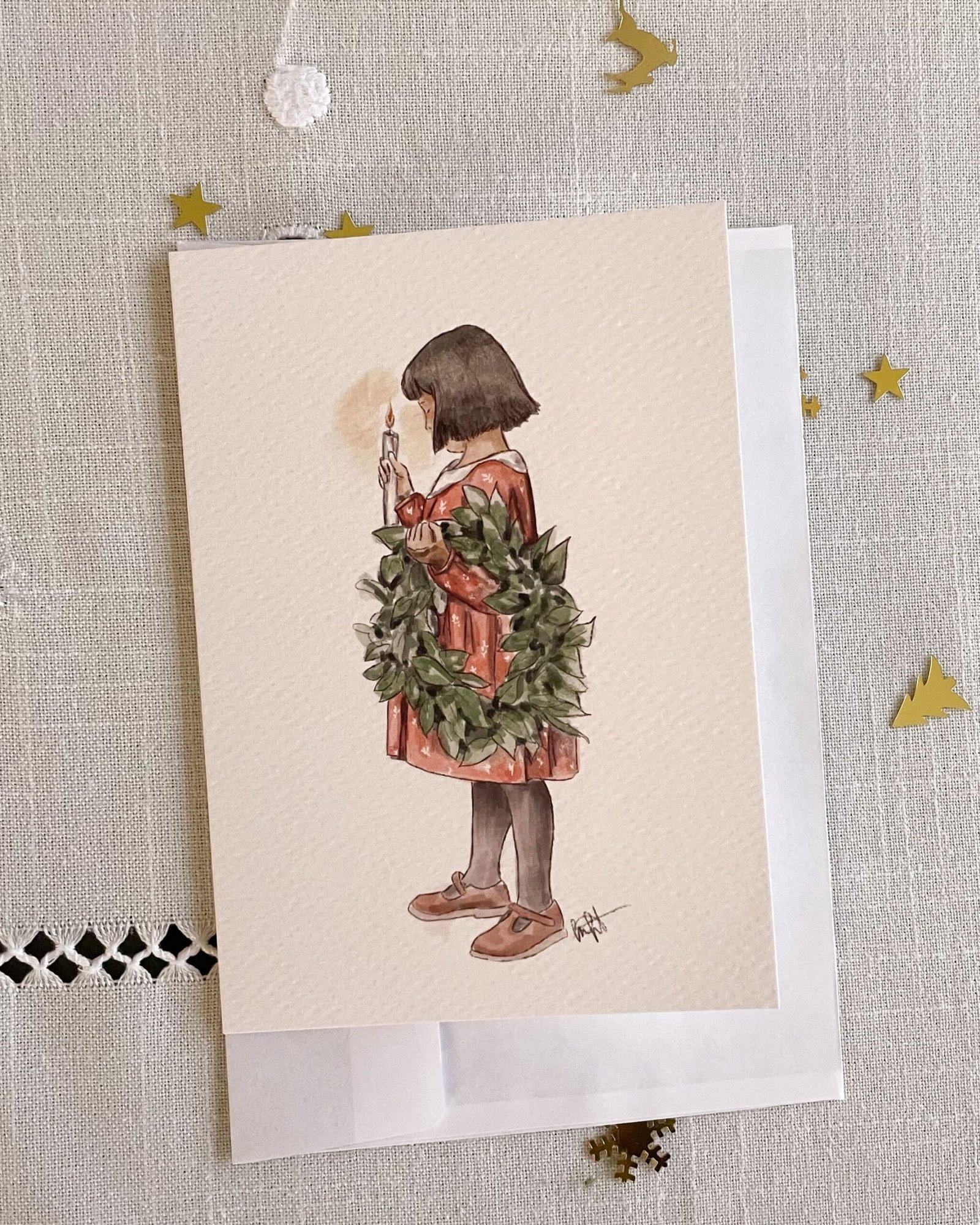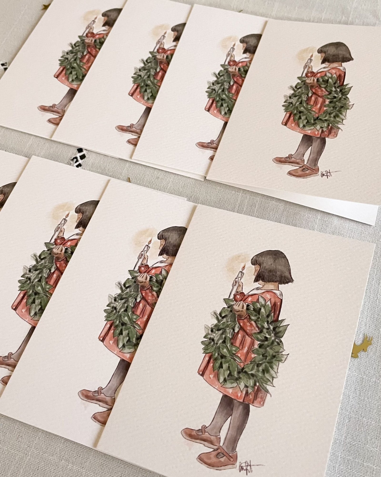 Cada christmas viene plegado en formato A6 (15×10 cm cuando está doblado), impreso en papel Tintoretto, un papel de alta calidad de 300 gramos con textura acuarela.